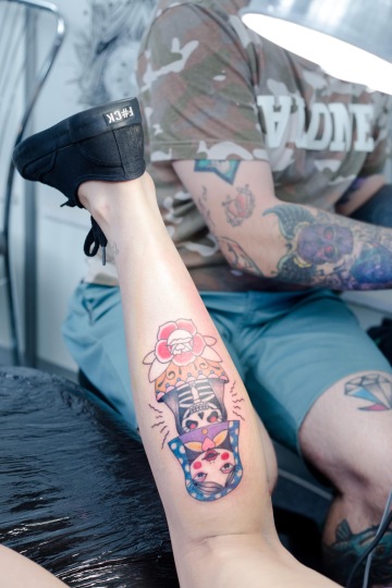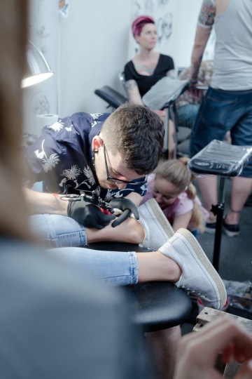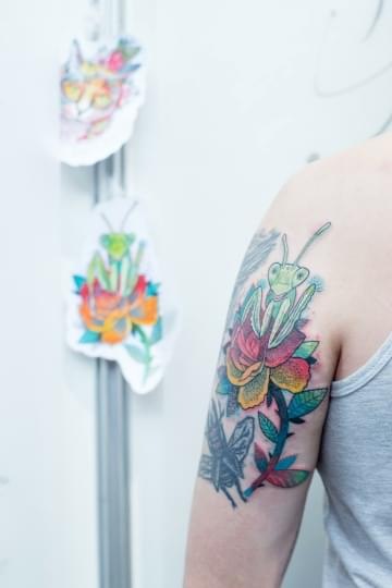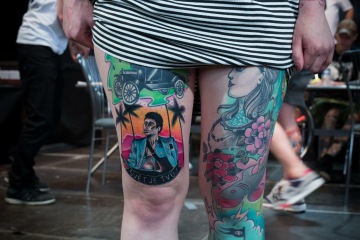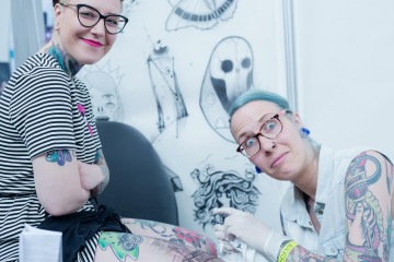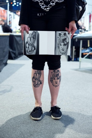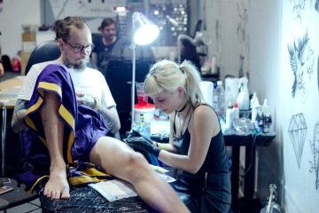 Letošní konvence byla moje první, takže když jsme dorazili na místo, byla jsem už patřičně nervózní. Za malou chvíli jsem zjistila, že nemám strojek a zdroj! Zkrátka všechno, co je k tetováni potřeba, jsem zapomněla doma. Následovalo zjištění, že mé první, tak pečlivě připravované portfolio, je na úplně jiné cestě, k úplně jinému člověku. Tuto situaci naštěstí pohotově vyřešil pan kurýr. Po pár hodinách se ukázalo, že konvence není nic hrozného a začala jsem si ji užívat. Poznala jsem jednoho skvělého tatéra z Itálie - Priamotattoo, od kterého jsem se nechala na konvenci potetovat. Co se mi moc nelíbilo, bylo málo kategorií, do kterých lze jen těžko zařadit některé práce tatérů a teměř žádné vegan/vege jídlo - brambory zas tak moc ráda nemám. Iva