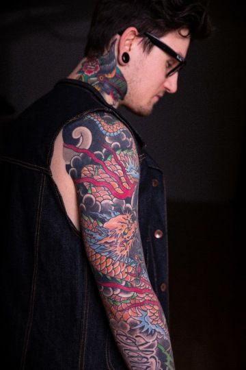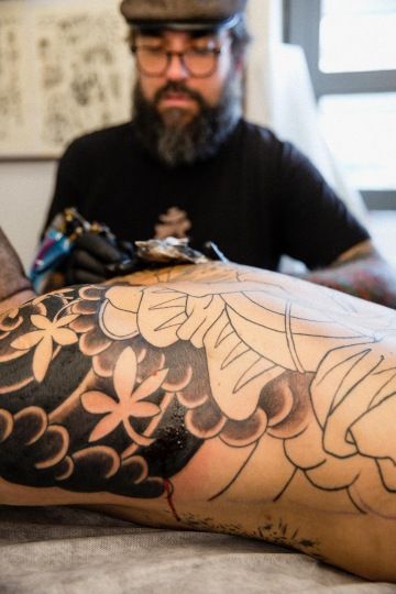 I started in the Japanese style in 2000 but was first influenced by European guys, it was more illustrated, more fancy details, more colours etc. Slowly over the years I started to move in a more traditional Japanese direction, and then In 2013 I went to get tattoo by my friend Rico Daruma, watched the way he worked, spent some time with him and his wife, Shion. I saw their studio environment and paintings and I was really inspired to focus on that style. Since then, I’m trying to make tattoos that looks Japanese. I'm not tryin' to so much have my own style, I'm tryin’ to make it look like traditional Japanese tattoo, as opposed to it looking obvious that Scott Ellis did it.