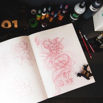 So what I do is I practise a lot in my sketch book, I prepare for the client, decide the way the tattoo’s gonna look. I make the basic composition and then I focus on, for instance if it's a dragon like today, I'm gonna draw it's face few times, so I can really get the personality that I want. Also there are many ways to draw the feet so I work those details out on paper when I make the sketches, and I'm ready when the customer comes to make the actual drawing on the body with the brush.