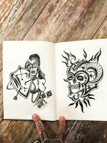 "I make tattoos that represent me. I believe they work well on the skin and will never be just a fashion.I like the aesthetic of old-school t-shirts like Bon Scott from ACDC had, I also collect knives, I like skulls and snakes... so I make these punk/biker t-shirts."